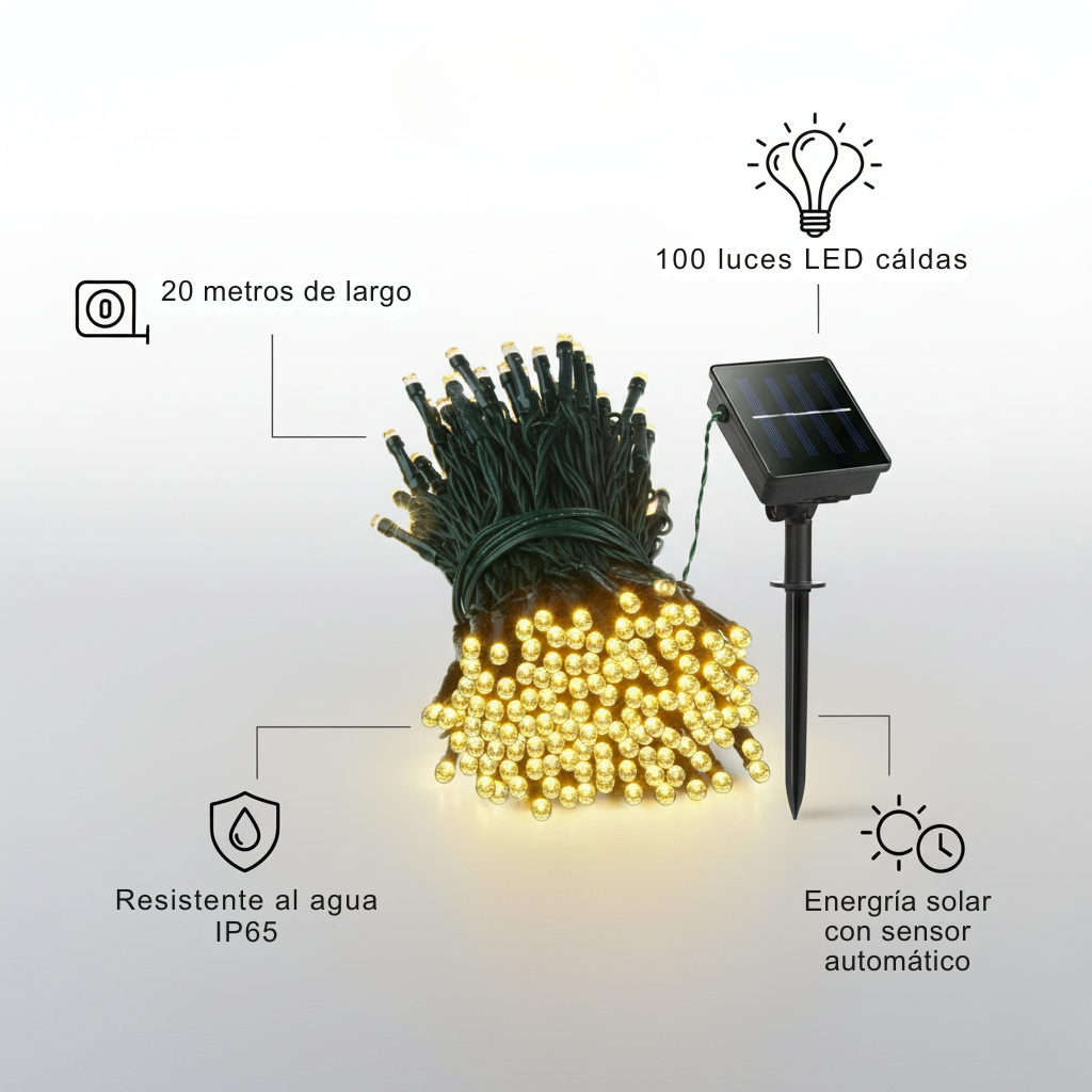 20 metros de luz cálida para iluminar tus noches con energía solar.