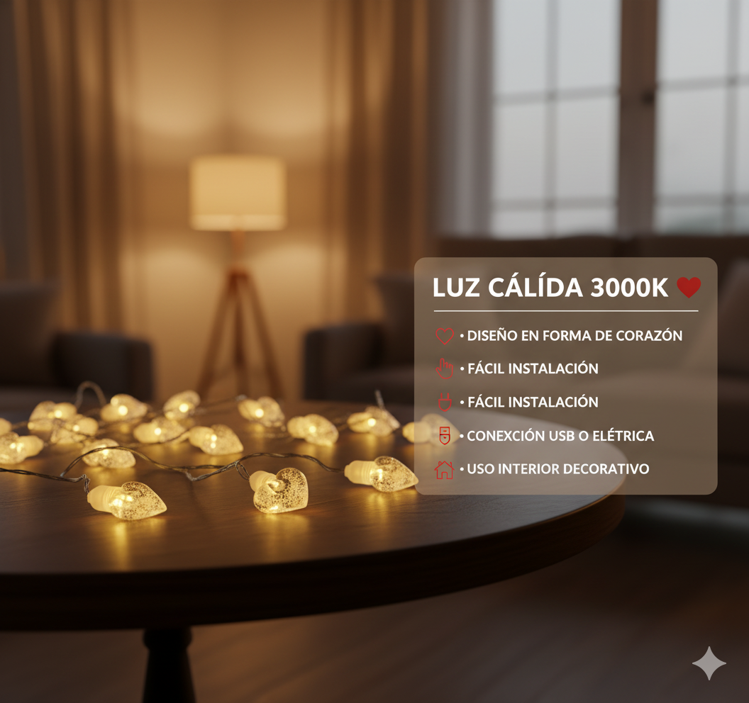 Su iluminación suave y dorada crea una atmósfera íntima y relajante, ideal para noches especiales, cenas, celebraciones o simplemente para decorar con amor.