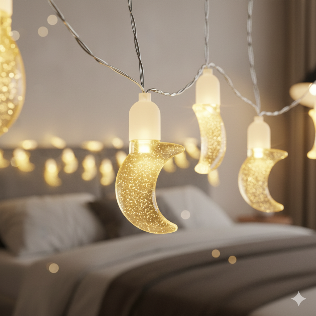 Cada luz está moldeada con la forma de una luna brillante, reflejando destellos sutiles que aportan un aire celestial y moderno a tu decoración.