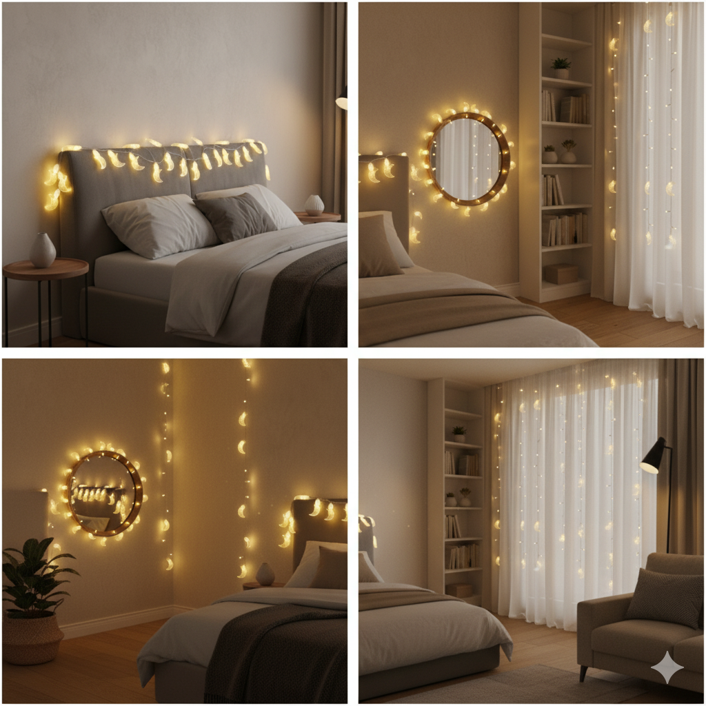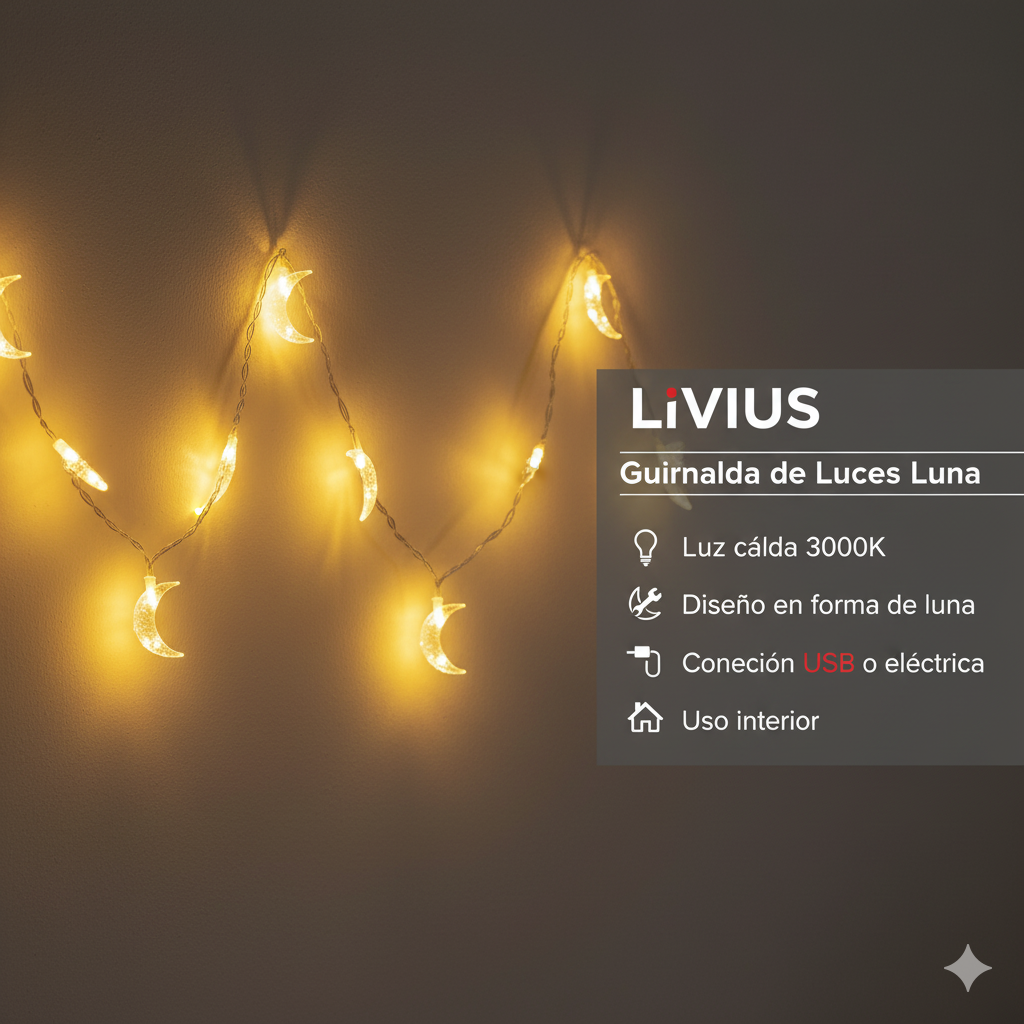 Dale un toque mágico y acogedor a tus espacios con las Guirnaldas Moon de Livius, una colección de luces LED con delicadas figuras de lunas que transforman cualquier ambiente en un rincón lleno de calma y estilo. Perfectas para decorar habitaciones, balcones, terrazas o eventos especiales.