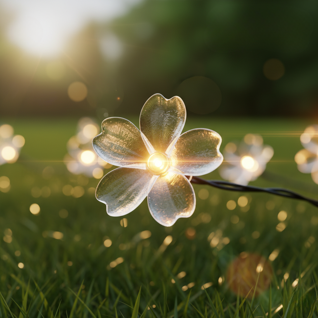 Cada luz tiene forma de flor, con pétalos translúcidos que difunden una luz cálida y suave, creando una atmósfera romántica y natural. Ideal para decorar plantas, cercos, eventos o rincones especiales de tu hogar.